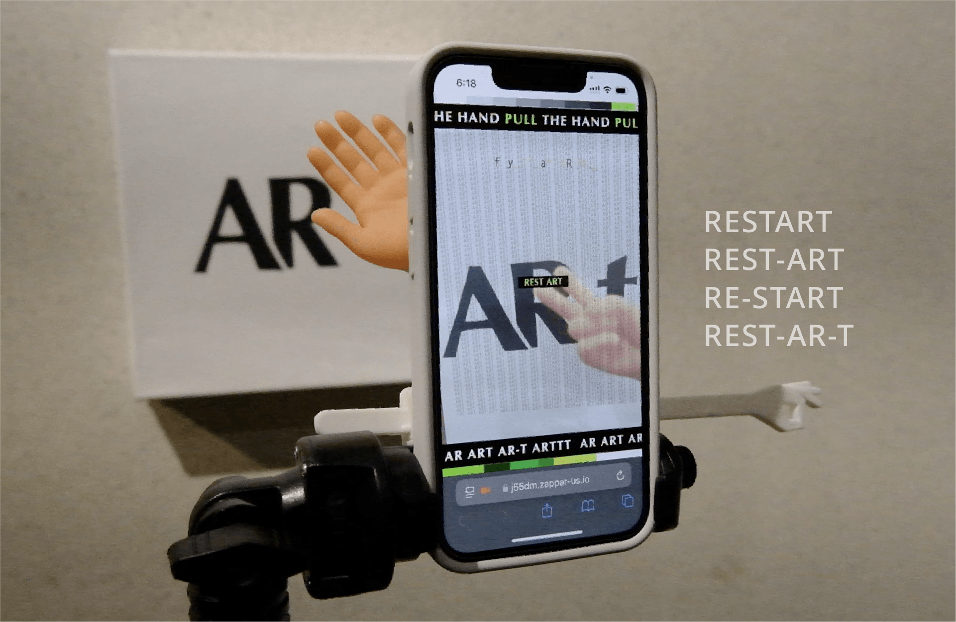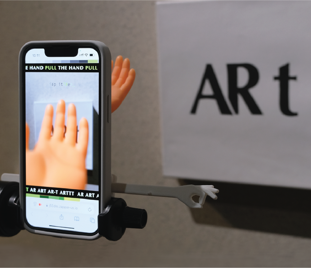 AR t is a poetic augmented reality installation featuring a 3D printed hand shaped video switcher and a self painted ARt canvas. By waving a hand above the device, viewers trigger randomized YouTube search results generated from my freewriting on the word ART.